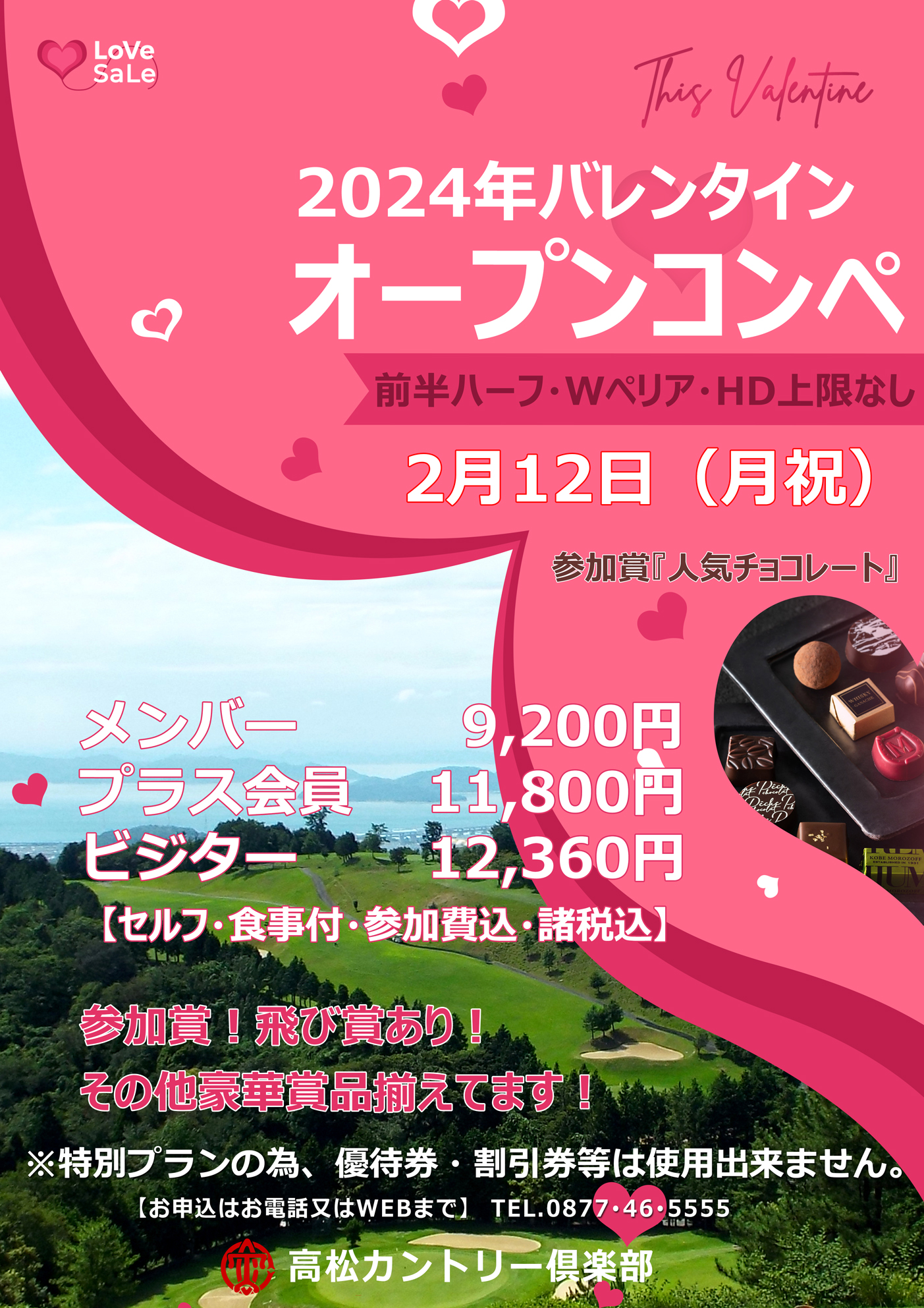 2/12 バレンタインオープンコンペ開催 by takamatsu on 2024年1月24日 with コメントはまだありません 2月12日(祝)に、バレンタインオープンコンペを開催いたします💛 参加賞は人気チョコレートをご用意🍫飛び賞には豪華賞品を取り揃えております! 昼食はバレンタインオープンコンペ限定のスペシャルランチをご用意! 皆様のご参加お待ちしております!!