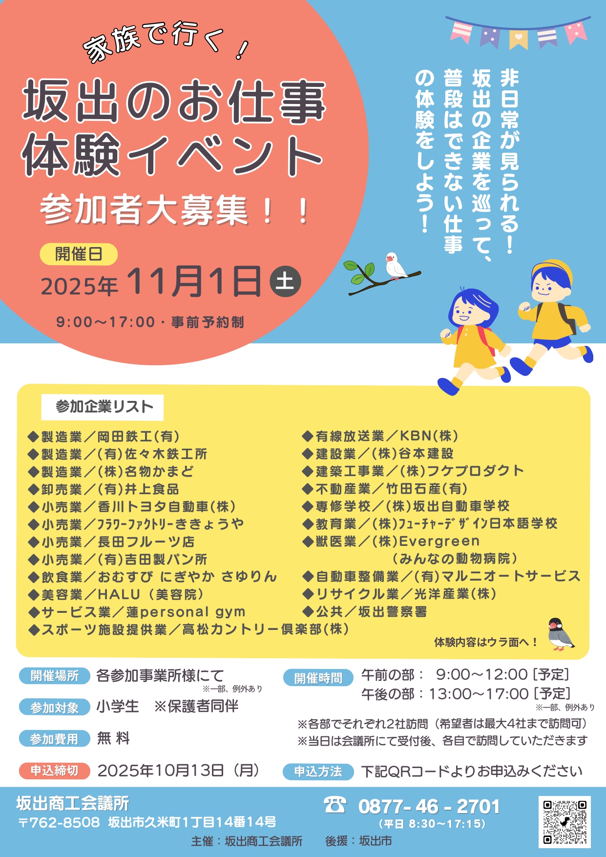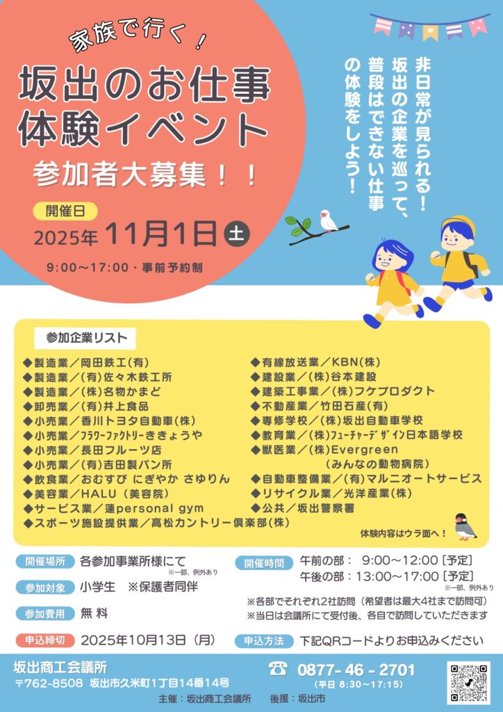 坂出のお仕事体験イベント 参加者大募集! by takamatsu on 2025年10月2日 with コメントはまだありません 開 催 日:令和7年11月1日(土) 開催時間:14:00~15:00[予定] 参加対象:市内の小学生 ※保護者同伴 参 加 費:無料 申込締切:2025年10月13日(月) 申込方法:右記のQRコードよりお申し込みください。 高松カントリー倶楽部はカートに乗ってコース見学もできちゃいます!! 他では見る事のできない標高450mの大絶景!!天空のゴルフコースをぜひ見に来てください⭐ 坂出のことをもっと好きになること間違いなし☺✨ ご応募お待ちしております!